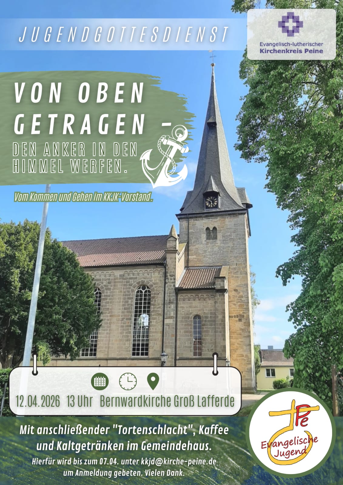 Jugendgottesdienst Date: 12.04.2026 Uhr: 13:00 Uhr Ort: Bernwardkirche Groß Lafferde, Bernwardstraße, 31246 Ilsede Mit anschl. *Tortenschlacht*, Kafee und Kaltgetränken im Gemeindehaus. Um Anmeldung bis zum 07.04. wird gebeten unter kkjd@kirche-peine.de |